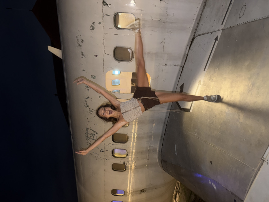 A young female is captured at night, standing on the wing of a decommissioned airplane at the "Gate 88" or "Abandoned Plane" attraction in Kuta, Bali, Indonesia. The light-skinned female, with long brown hair, exhibits a broad, open-mouthed smile. She wears a light-colored, strapless top and dark shorts, with white athletic shoes on her feet. Her arms are raised above her head, palms open, while her left leg is extended horizontally to her side in a dynamic pose. Her right foot remains planted on the plane's wing, casting a distinct shadow. The background consists of the plane's weathered white fuselage, displaying peeling paint and multiple illuminated rectangular windows. Above the plane, a dark sky and a section of a red-tiled roof are visible. The metallic wing surface features dark directional markings.