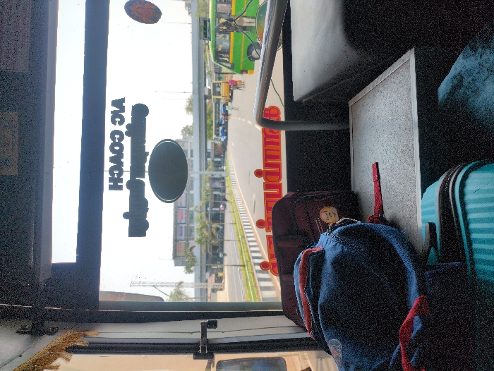 The image depicts an exterior urban scene viewed from inside a bus, specifically through its front windshield. Inside the bus, on the lower left, a dark blue backpack with red accents rests on a shelf, behind which a maroon bag is partially visible. Below these, a light blue striped suitcase is also partially visible. A grey padded seat and a metallic handrail are present on the right side of the bus interior. Reflected on the bus windshield, the reversed English text "AC COACH" is prominent, along with reversed Tamil script below it, and a circular red decal and an oval black decal. Outside the bus, a multi-lane asphalt road with a central divider marked by white bollards extends into the distance. The Tamil word "திருவண்ணாமலை" (Tiruvannamalai) is visibly painted in red on the road surface in the midground. Several vehicles are present on the road: a distinct green and yellow bus is on the right, and further down the road, a yellow bus and a blue bus are parked or moving. Multiple pedestrians, including a small group with a child, are walking on the right side of the road. In the background, a large, multi-story commercial building with visible storefronts stands on the left. An elevated road or flyover spans horizontally across the scene. Palm trees are scattered throughout the background, and the sky is clear, indicating daytime conditions. The scene is identified as the Tiruvannamalai New Bus Stand in Tiruvannamalai, India, based on the prominent Tamil inscription on the road surface and the characteristics of the urban bus terminal infrastructure.