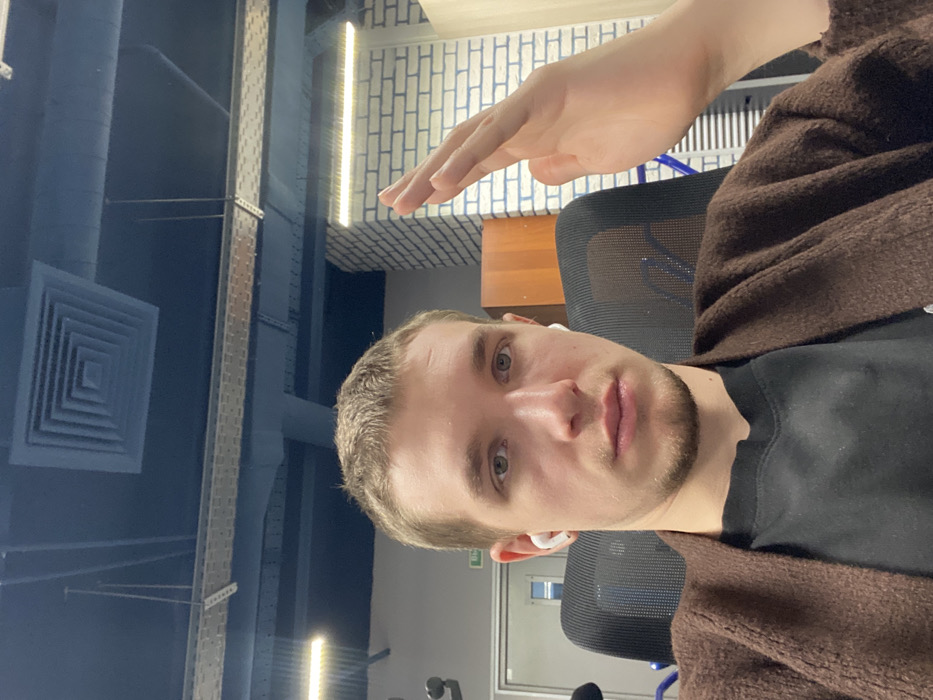 A fair-skinned man with short blond hair and a goatee poses for a selfie. He wears a brown cardigan over a black shirt and has white earbuds in. His hand is raised, palm down, near his face. The background features an office space with a blue ceiling, metal beams, an air vent, and brick-patterned walls. A wooden desk and black office chair are visible. The image is rotated counterclockwise.