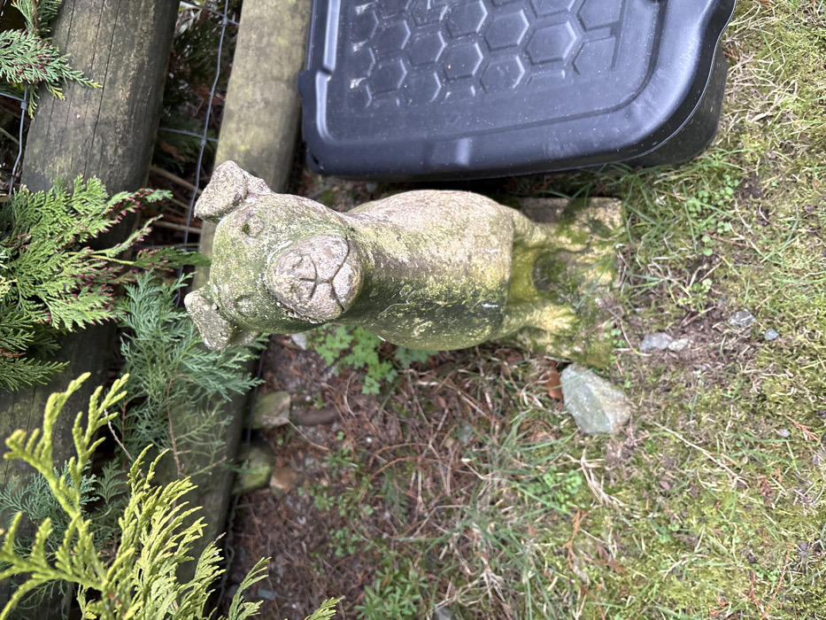 The image displays a static outdoor scene in Shrewsbury, United Kingdom. A weathered stone dog statue, approximately 0.5 meters in height and heavily covered in green moss and algae, occupies the central foreground, facing directly towards the viewer. The statue depicts a dog with short, upright ears and a broad snout. It rests on an uneven ground surface composed of sparse green grass, patches of exposed soil, dried organic debris, and several small stones. To the immediate right of the statue, a portion of a black, rectangular plastic container with a textured, hexagonal pattern on its lid is visible. The background consists of dense evergreen conifer foliage, displaying varied shades of green, which partially obscures a horizontal wooden log or beam. No individuals or dynamic actions are depicted within the scene.