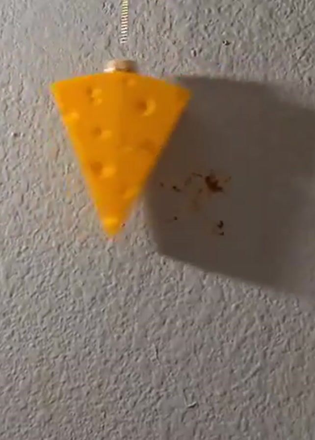 A video shows a yellow cheese slice ornament hanging in front of a textured gray wall