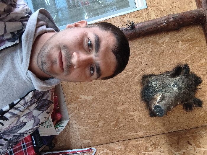 The image depicts an indoor scene in the city of Sredets, Bulgaria. A male individual is positioned in a mid-shot, facing the camera directly with a neutral expression, consistent with taking a selfie. He has short, dark hair and light stubble. He is wearing a light grey hooded sweatshirt under an open jacket featuring a camouflage or botanical pattern with dark and light foliage. The background walls are constructed from oriented strand board (OSB). On the upper right portion of the wall, a taxidermied wild boar's head is mounted, displaying dark fur and visible tusks. To the left, part of a white window frame is visible, through which blurred outdoor scenery, including trees, is discernible. In the lower right background, a partially visible cardboard box, marked with "INDUSTRY KS," contains several red objects, possibly fruits. Beneath the box, a red and black checkered fabric is visible, along with a white object marked "CROWN." A dark, grid-like structure is also present in the lower right. A vertical wooden beam is visible in the upper left corner.