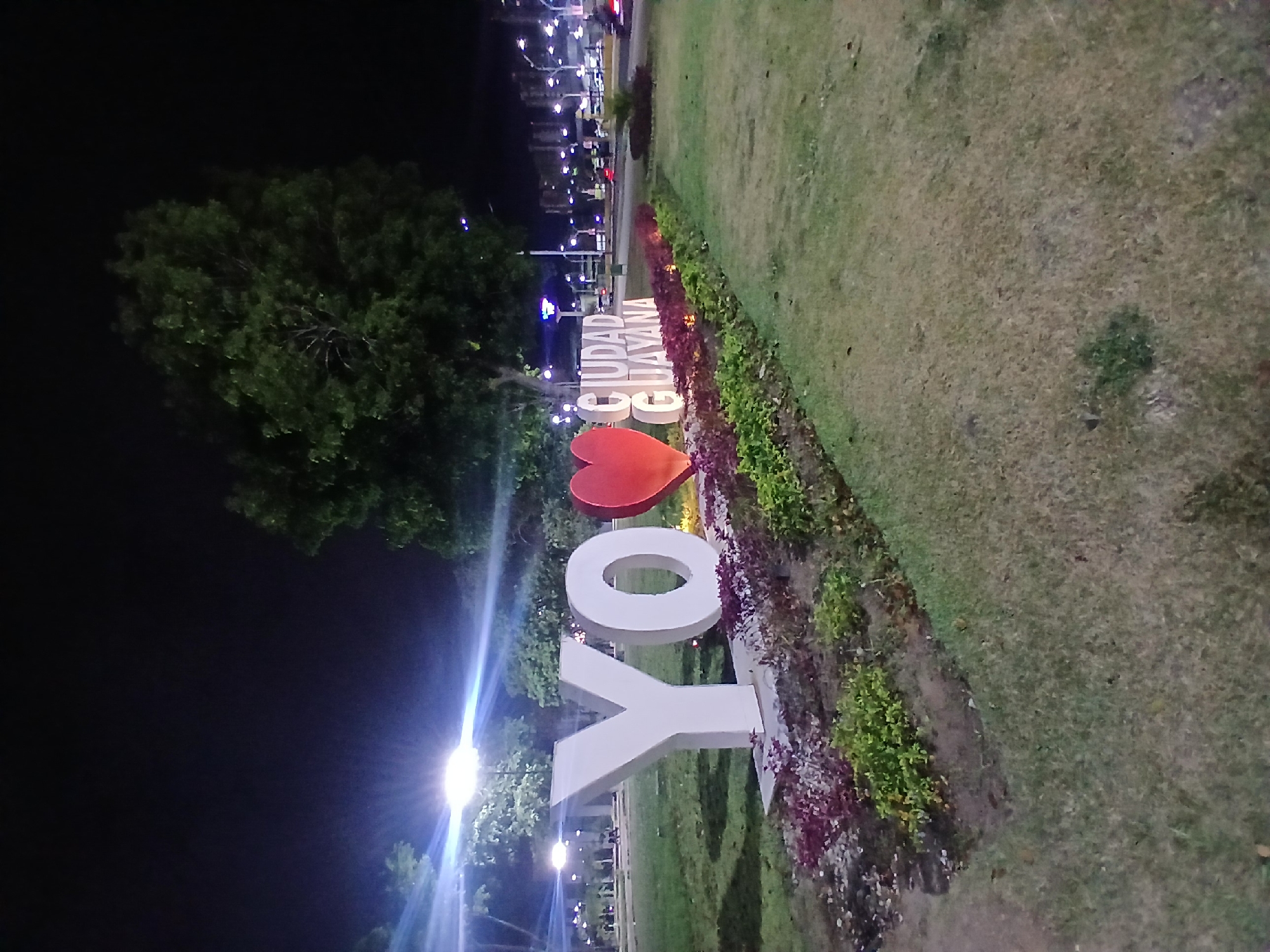 A nighttime photograph captures a public green space in Guayana City, Venezuela. The central feature is a large "YO ❤️ CIUDAD GUAYANA" landmark sign, composed of oversized white block letters "YO", a prominent glowing red heart symbol, and white block letters spelling "CIUDAD GUAYANA" below. This sign is positioned within a well-maintained flowerbed displaying reddish-purple and green foliage, set against a backdrop of green grass. To the left and right, large trees are partially illuminated by artificial light. In the background, a street or road is visible with streetlights casting ambient light, and faint vehicular lights are discernible. Distant buildings or structures are dimly lit. Several bright artificial light sources, likely streetlights, produce distinct lens flares in the upper left quadrant of the image. Indistinct human figures are visible on a paved path in the far left background. No specific interactions or detailed actions are clearly depicted.