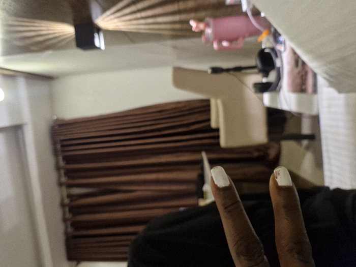 A brown, horizontal-slatted window blind is partially visible behind a beige chair. Two fingers are raised in a peace sign, the nails painted white. A lighted wall sconce emits rays on the ceiling. In the background are cosmetic products, including pink containers. The image is blurry.