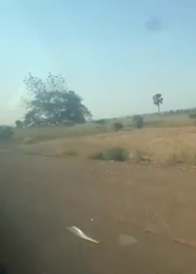 view from inside a moving vehicle traveling on a paved road. The road is bordered by dry, grassy land with scattered trees. The sky is a clear, light blue. The camera is positioned inside the vehicle and slightly tilted, and there are reflections visible on the windshield. The overall environment suggests a rural, dry region.