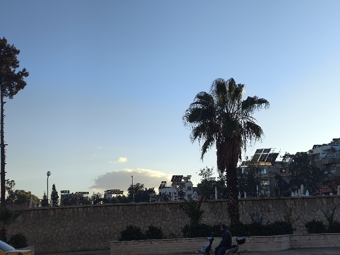 The image depicts an urban outdoor scene in the city of Unknown, Unknown, under a clear blue sky with minimal cloud cover. In the foreground, a light-colored scooter is parked on a paved surface, with a male individual wearing dark attire seated on it, facing right. Directly behind the scooter is a low, light-colored concrete barrier. Behind this barrier, a substantial stone-clad wall extends horizontally across the frame. To the left, a tall, slender pine tree with sparse foliage at its apex and visible decorations or wiring along its trunk stands vertically. A portion of a yellow vehicle is barely visible at the bottom left corner. In the midground, above the stone wall, a single street light on a pole is visible, along with distant rooftops and trees. A large palm tree with dense fronds stands prominently on the right side of the frame, in front of the stone wall. Behind the wall and the palm tree, numerous buildings are visible on a rising incline, many equipped with solar panels on their rooftops. The environment suggests an established residential or mixed-use urban area during daylight hours.