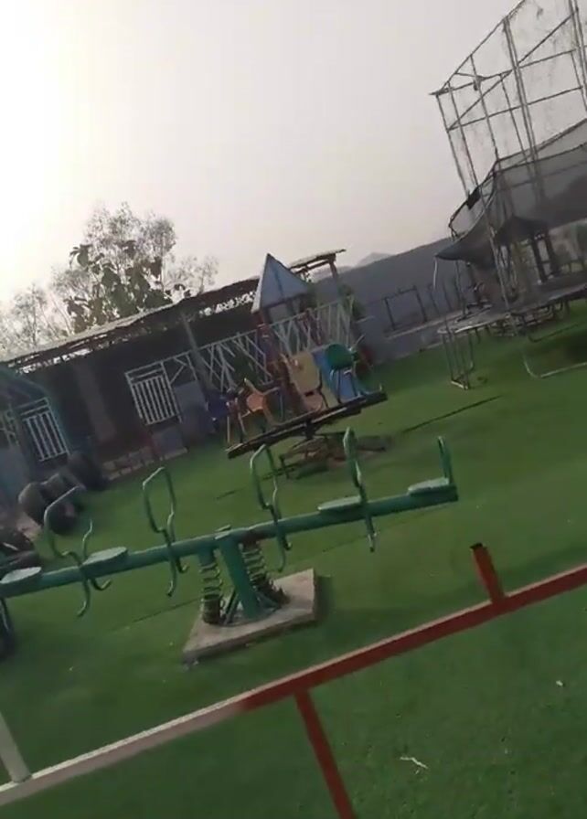 wide shot of an empty playground on a bright, overcast day. The playground has artificial green turf. In the foreground, a green seesaw with spring mounts sits centered. To the left of the seesaw, several tires are stacked. In the background, a small building with a sloped roof stands to the left, with a swing set and a merry-go-round visible behind it. A large netted trampoline structure sits on the right side of the frame. A red railing is visible in the lower foreground, partially obstructing the view.