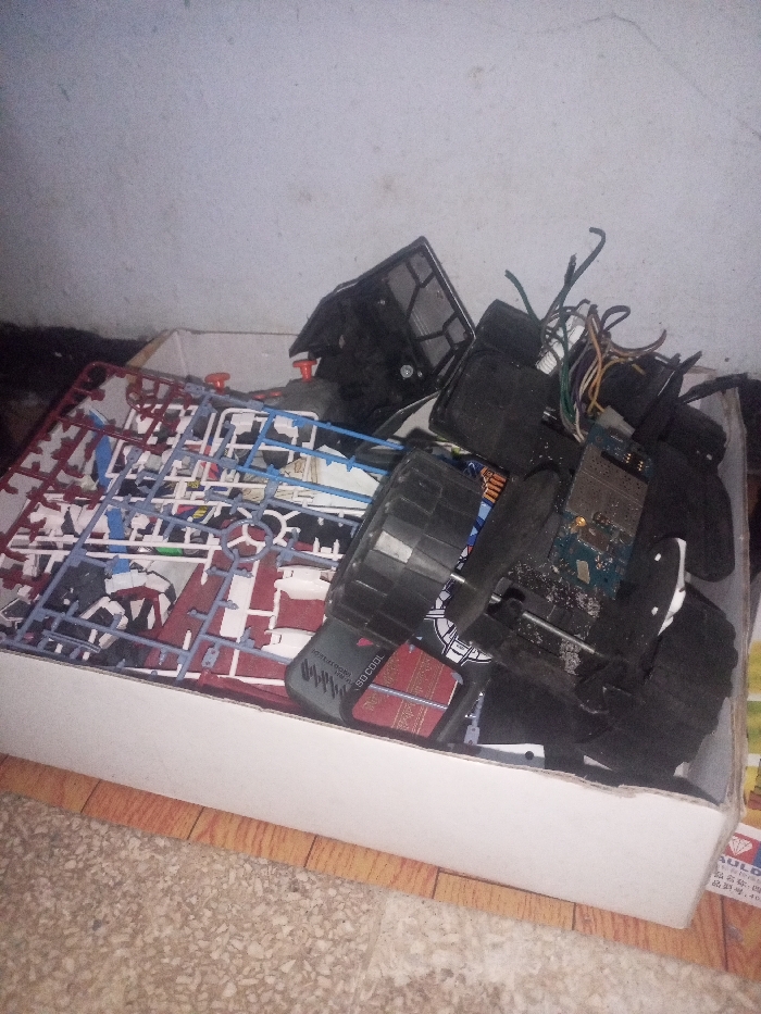 In Ciherang, Indonesia, a white cardboard box containing miscellaneous items rests on a speckled floor against a light-colored, scuffed wall. The box's left side holds multiple plastic model kit sprues in red, blue, and white, with some partially detached components. The right side of the box contains an jumbled assortment of disassembled electronic components, including several black plastic casings, an exposed circuit board with visible microcircuitry, and a bundle of multicolored wires (green, yellow, white, purple, orange). A section of wood-patterned flooring is visible beneath the box, and a portion of another white commercial box, bearing text in an Asian script and a diamond logo, is partially visible on the speckled floor adjacent to the main box. No individuals are present in the image.