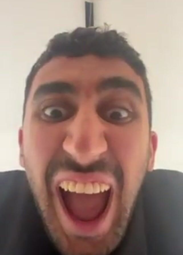 A man with dark hair and a short beard looks up at the camera with a wide-eyed, surprised expression, his mouth open in a yell