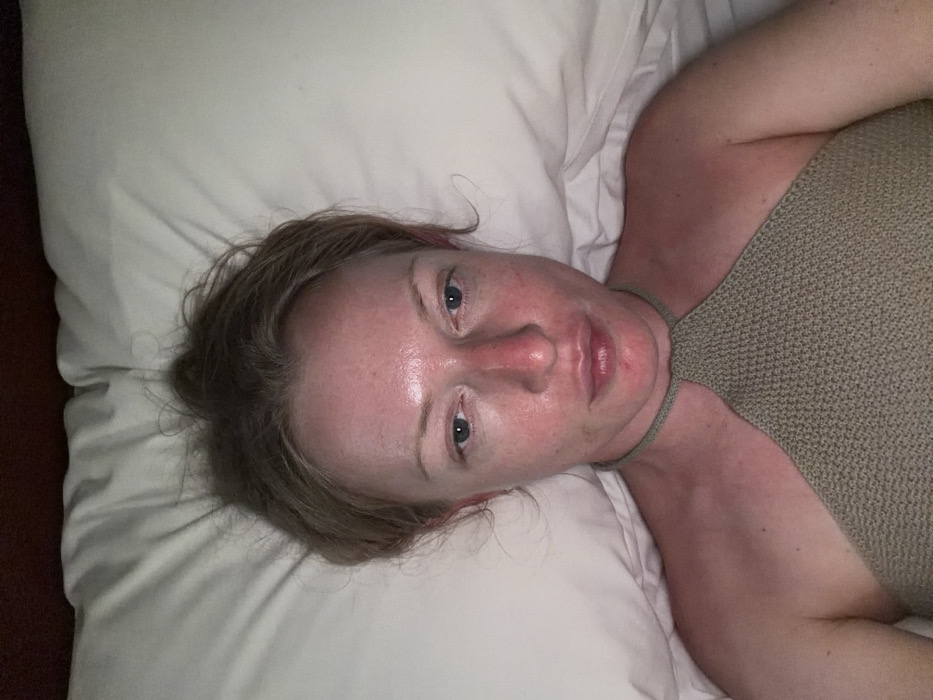 A woman lies on a white pillow, facing the camera. Her skin appears flushed and slightly shiny. She has light hair pulled back, revealing blue eyes. She wears a halter-style top in a neutral tone with a visible knitted texture. The background includes a portion of dark wood, suggesting a headboard or furniture. The overall lighting suggests an indoor environment, possibly a bedroom setting.