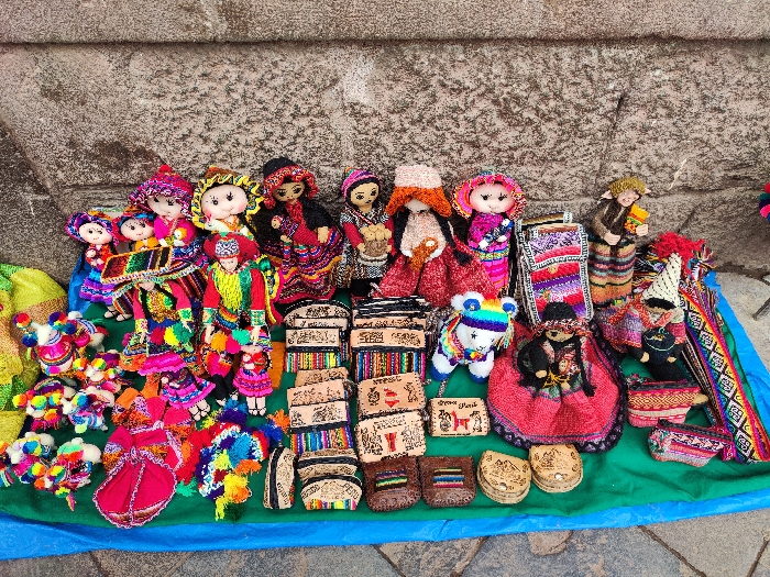 A detailed view of a handicraft vendor's stall is depicted outdoors in Wanchaq, Peru
