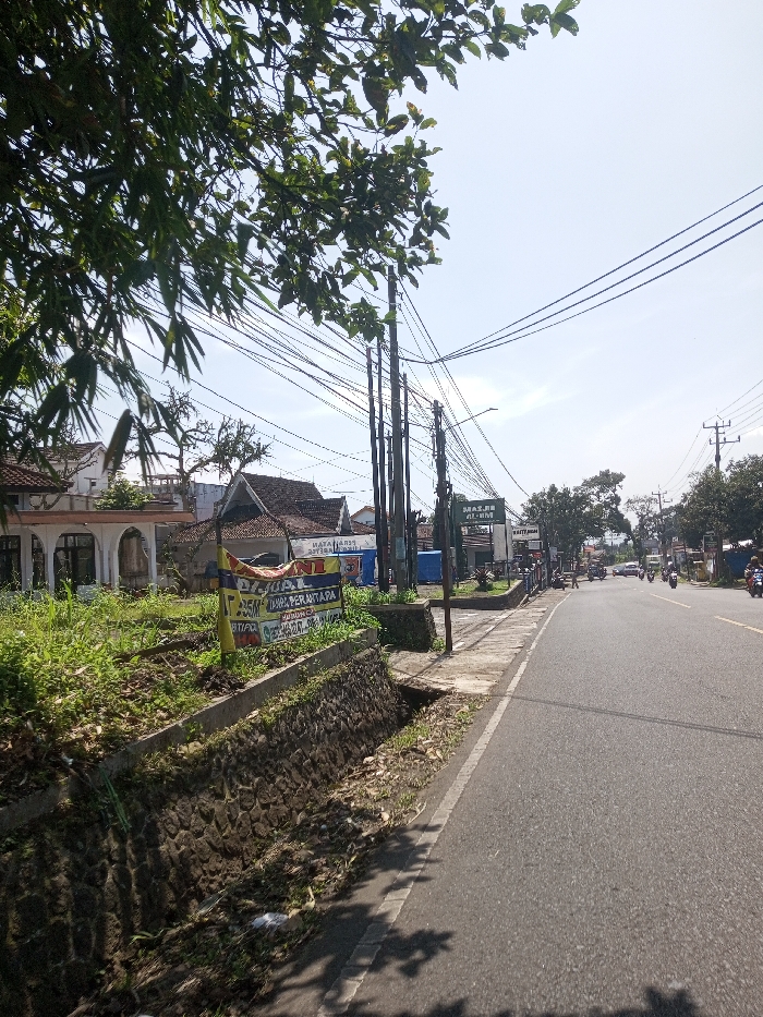 The scene depicts a sunny, daytime view along a semi-urban road, identified as Beteng_Pangkhar_Somthrang, Bhutan. A two-lane asphalt road occupies the center and right foreground, extending towards the upper right background. Shadows from overhead foliage are cast across the road's foreground. On the left side of the road, a concrete sidewalk is present, bordered by a stone-faced drainage ditch that contains dried leaves and some debris. Above the ditch and sidewalk is an elevated patch of unkempt, overgrown grass. A prominent yellow and blue banner sign is displayed in this grassy area, facing the road. The sign features text in Indonesian, including "DIJUAL" (For Sale), "TANPA PERANTARA" (No Middleman), and "2.5M". Behind this sign, several buildings are visible; the closest is light-colored with arched openings, while others further back have pitched, tiled roofs. A dense array of utility poles, some wooden and others concrete, line the left side of the road, supporting a complex network of overhead electrical and communication wires. Lush green foliage, likely from trees or bamboo, partially obscures the upper left quadrant of the image. On the right side of the road, in the mid-ground, additional utility poles are visible. Several commercial structures are present, one with a sign partially legible as "MASJID AL-IMAN" and another suggesting "MATAHARI." Multiple motorcycles, some with riders, are observed moving away from the camera or parked along the road's edge. A light-colored vehicle is also visible further down the road. The sky above is largely clear with a light blue hue.