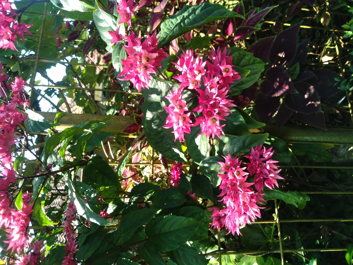 The image depicts a close-up, static scene of a flowering plant located in the city of Cibeureum, Indonesia. The central subject is a plant with abundant clusters of bright pink, star-shaped flowers, each featuring lighter pink or white centers. These flowers are intermingled with numerous dark green leaves, some of which exhibit sunlit reflections. A dark green or black grid-patterned metal fence or trellis is visible on the left side and in the background, partially obscured by the foliage. A light brown, vertical support pole, possibly made of wood or bamboo, stands near the center of the frame, providing support to the plant. In the lower right, a distinct plant with dark purplish-red foliage is visible. The upper right background contains blurred elements of a light-colored structure, possibly a building, with a visible brown tiled roof. The scene is well-illuminated by natural sunlight. No individuals, actions, or direct interactions are present.