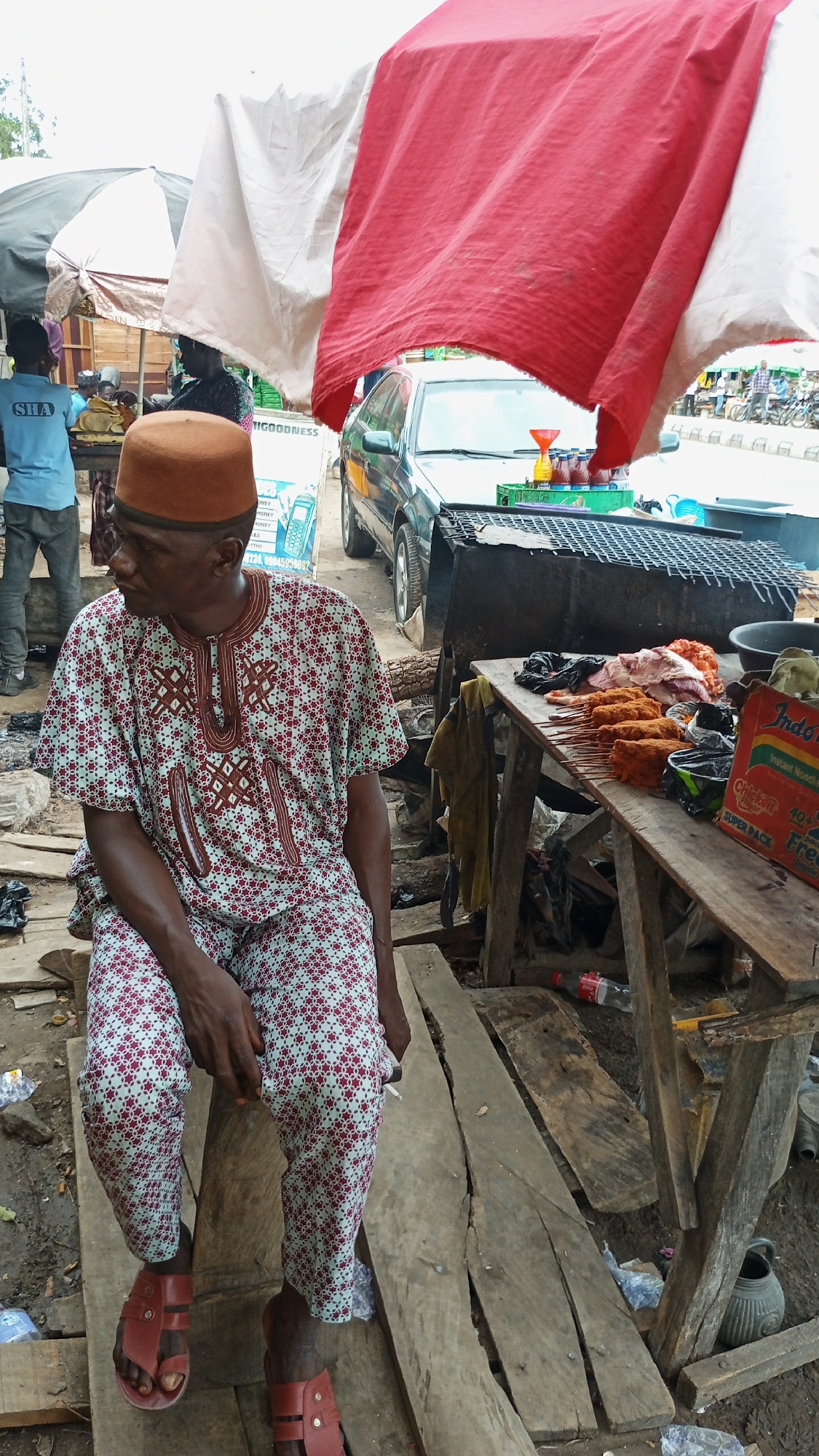 A man with a brown hat and patterned maroon and white clothes sits on a wooden structure in what appears to be an outdoor market in Zango-ndaji, Nigeria