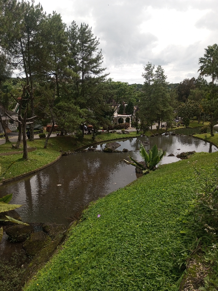 A winding pond reflects trees under a cloudy sky. Green grass and lush plants border the water's edge. Several trees dot the landscape, with a building visible in the distance. The scene captures a tranquil natural setting.