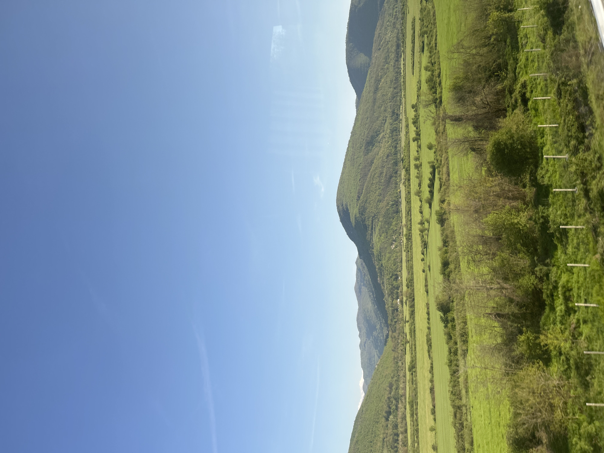 landscape in Brestnitsa, Bulgaria. The foreground consists of a green field with scattered trees and wooden poles. In the midground, a lush mountain range extends across the frame, covered in green vegetation. The background is a clear blue sky with faint cirrus clouds.