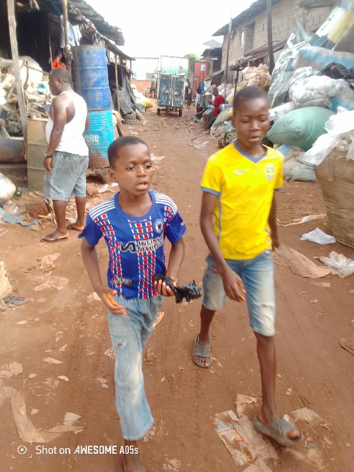 The image depicts an unpaved, reddish-brown dirt path in Onitsha, Nigeria, under an overcast sky. Two pre-adolescent boys walk along the path in the midground. The boy on the left wears a blue and red patterned short-sleeved shirt and faded light-colored jeans, holding a dark, irregular object in his left hand. The boy on the right wears a yellow short-sleeved shirt, faded denim shorts, and grey slide sandals. In the left background, an adult male in a white tank top and grey shorts stands near two stacked blue metal barrels; the lower barrel displays "RADIUS COAL" text. Both sides of the path are lined with accumulated refuse, including plastic bags, white sheeting, and large sacks of various materials. Adjacent to the path are rudimentary structures, some with corrugated metal roofs. Further in the background, other individuals and a small cargo vehicle are visible along the path.