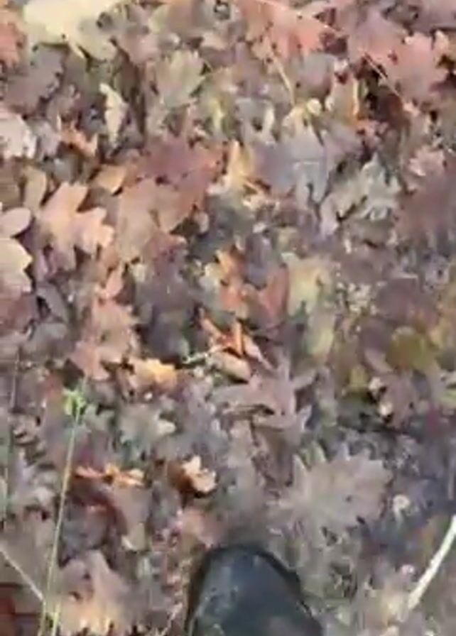 person walking through a wooded area covered in leaves. The ground is carpeted with fallen brown leaves and some grass. The trees are mostly bare with a few brown leaves clinging to their branches. The person is wearing dark clothing and an orange hat. They walk across the screen from left to right.