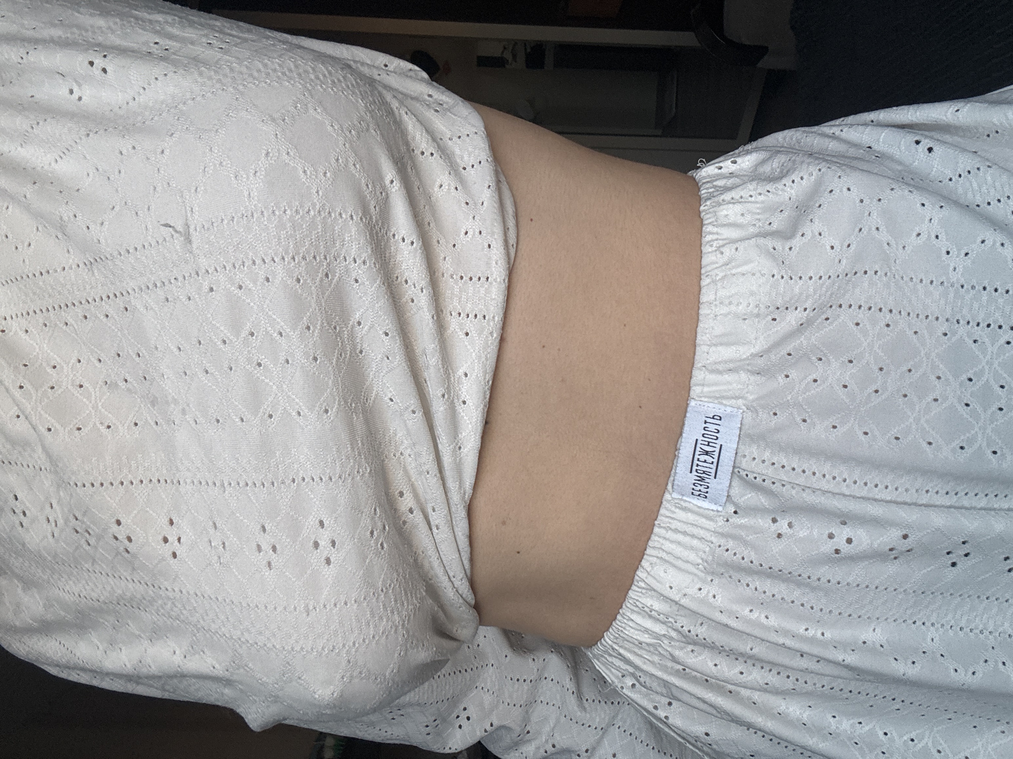 A close-up, waist-level indoor photograph shows the torso of an individual, likely female, from just above the chest to the upper thighs. The subject wears a two-piece light-colored (appears white or off-white) eyelet lace outfit consisting of a long-sleeved cropped top and a skirt. The top features a pattern of small circular perforations arranged in a diamond grid with vertical dotted lines, and its fabric is slightly sheer, revealing the contour of a left nipple. The midriff is exposed between the bottom hem of the top, which appears slightly gathered, and the elasticated waistband of the skirt. The skirt exhibits the same eyelet lace pattern as the top. A white fabric label with black text, reading "БЕЗМЯТЕЖНОСТЬ" (BEZMYATEZHNOST', translating to "Serenity" or "Tranquility"), is affixed to the front center of the skirt's waistband. The background is uniformly dark and indistinct, offering no specific visual cues to identify a precise location within Perm, Russia. The individual is standing and faces slightly to their left.