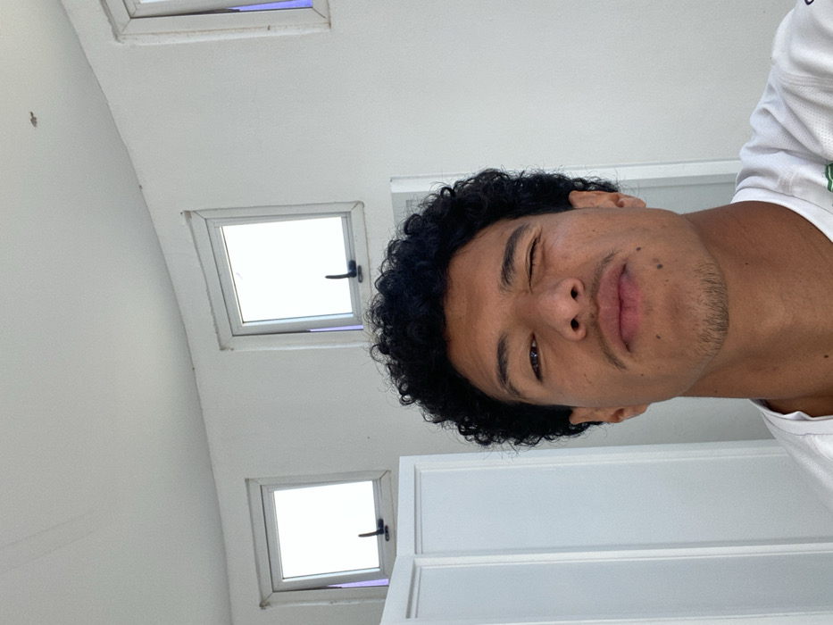 A selfie, rotated, displays a light-skinned person with curly black hair