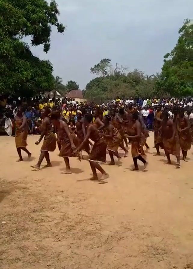 group of women dressed in matching brown and yellow patterned outfits performing a traditional dance in a clearing. The dancers are barefoot and move in unison, their arms moving in rhythm with their steps. A man in a red tank top and black shorts walks in front of the dancers. The dance takes place in a dusty clearing surrounded by trees, with a large crowd of spectators in the background. The sky is overcast.