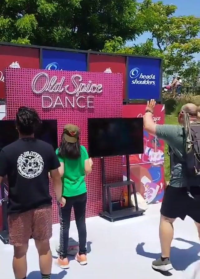 A promotional dance activity by Old Spice is occurring outside in a park-like setting on a sunny day