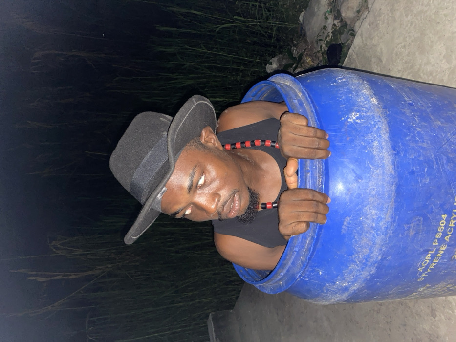 A man wearing a black fedora and a beaded necklace is peering out of a large blue plastic barrel. He is wearing a black tank top. The background appears to be a dark outdoor setting with vegetation visible in the upper left corner. Some text is visible on the side of the barrel. The image is slightly tilted. The man's expression is serious, and his hands grip the edge of the barrel.