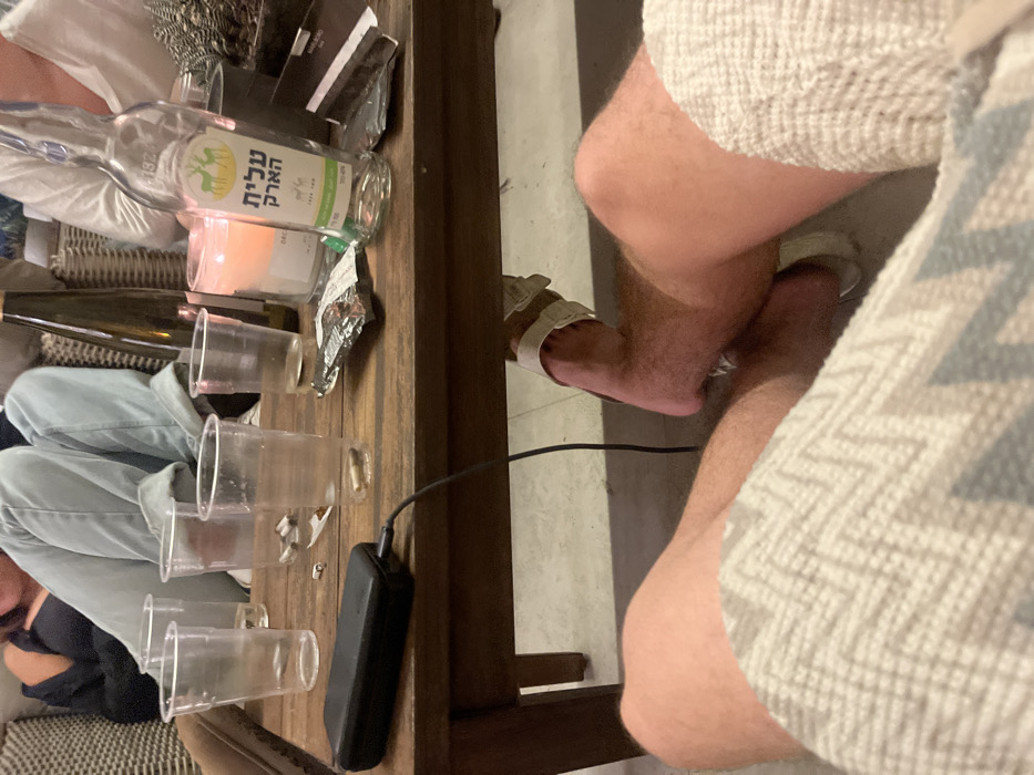 A low-angle shot depicts a table cluttered with an empty liquor bottle, plastic cups, a candle, and assorted items. A black power bank with a cable sits at the edge of the table. Adjacent to the table, bare legs and feet wearing white sandals are visible. A patterned blanket drapes nearby. The overall impression suggests a casual, relaxed setting, possibly after a gathering.