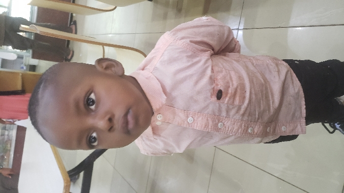 This image depicts a young child, appearing to be male and approximately 2-4 years old, with dark skin and a closely shaved dark hairstyle