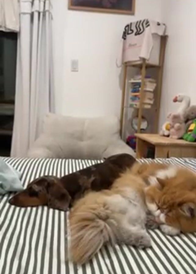 In a brightly lit room, a tan and white striped bed features a dachshund and a long-haired Persian cat lying side by side. The dachshund, a dappled brown color, rests near the edge of the frame, while the orange and white cat is nearer to the center, both animals appear to be sleeping. Behind them, there is a large tan pillow, a sheer white curtain, and a framed picture with a character depicted. A small wooden shelf stands to the right, stocked with books and displaying a white sweater. The lighting is neutral, and the scene is still, capturing a tranquil moment.