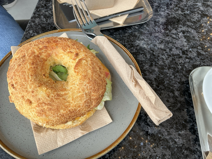 - "An overhead shot displays a bagel sandwich on a gray ceramic plate with a brown rim, situated on a dark, mottled granite table in Plovdiv, Bulgaria" by FM-Vbb4u1, licensed under CC BY 4.0