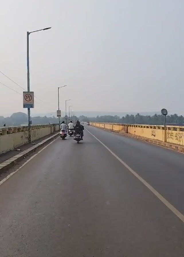 view from a moving scooter driving across a bridge. The bridge has two lanes with a single yellow line dividing them. There are several other scooters and motorcycles on the bridge, moving in the same direction. Street lights line the bridge. The bridge has yellow concrete barriers on either side, marked with graffiti. In the distance, trees and a hazy sky are visible.