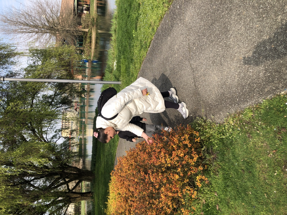 The image depicts an outdoor scene in Rodano, Italy, within a park setting adjacent to a body of water. In the foreground, an adult female and a young child are positioned next to a paved asphalt pathway and a prominent bush featuring vibrant orange and red foliage. The female, wearing a long white puffer coat, black leggings, grey athletic shoes, and a black backpack, is bent forward, extending her right hand into the orange bush as if examining or touching its leaves. Her dark hair is pulled back with a pink scrunchie, and she holds a small yellow object in her left hand. A young child, dressed in a dark top and grey pants, is partially visible behind the female, also interacting with the bush. The paved path, showing minor cracks, extends into the background, curving slightly. To the left, a large deciduous tree with light green, drooping leaves stands near the calm water body, which occupies the mid-ground and reflects the sky. Across the water, a multi-story building with balconies is visible, along with a smaller wooden structure and a green metal railing. A bare deciduous tree is located on the right side of the background. A grey utility pole stands vertically to the right of the large green-leaved tree. The scene is illuminated by natural sunlight, casting long shadows on the paved surface, indicating clear weather.
