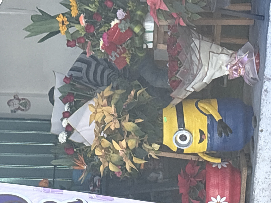 A slightly tilted outdoor shot reveals a vibrant floral arrangement. Bouquets of roses, sunflowers, and mixed flowers surround a colorful, cartoonish, minion-shaped object. The minion is painted in yellow and blue. The flowers and minion are arranged on a tiered display, possibly a makeshift roadside stall. A striped blanket can be seen behind some of the flowers. The image has a slightly grainy texture.