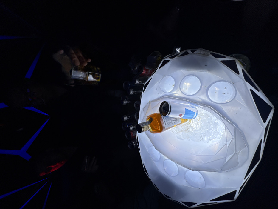 The scene depicts an indoor, low-light environment consistent with a nightlife establishment in Sofia, Bulgaria. A white, illuminated, geometric table occupies the foreground. Its central compartment contains crushed ice, an amber glass bottle labeled 'BUSHMILLS' whiskey, and an open Red Bull can. Circular recesses on the table's edge appear designed for drinks. In the upper right, a human hand holds a clear glass containing an amber liquid. A dimly lit human figure with red facial illumination is partially visible in the upper left background, beneath blue linear light fixtures. Behind the main table, numerous small, clear glass bottles and several aluminum cans are present on a dark surface, some appearing discarded.
