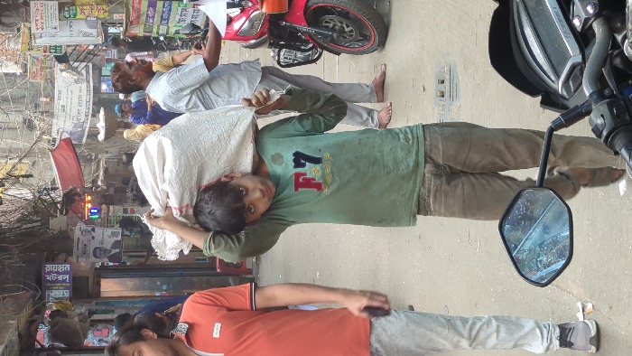 The image portrays a bustling street scene in an urban environment identified as Dhaka, Bangladesh