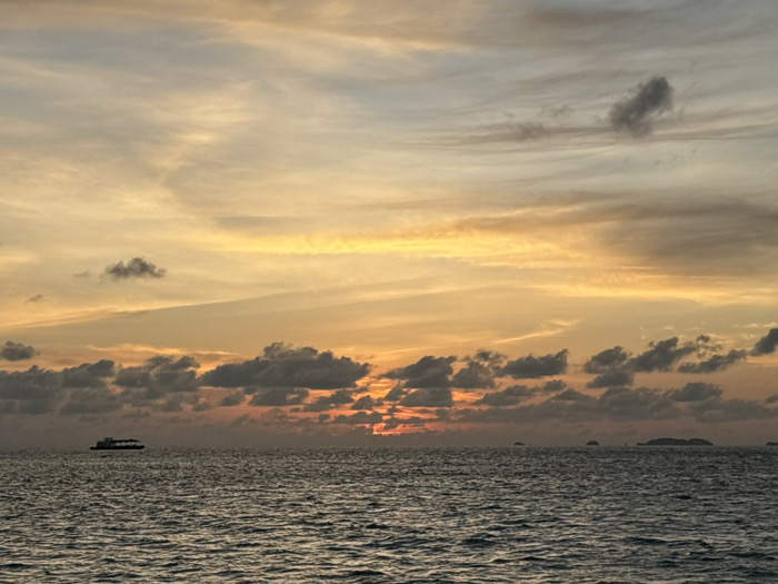 The image depicts a sunset over the Andaman Sea, near the city of Ban Ko Li Pe, Thailand. The sky dominates the upper two-thirds of the frame, showcasing layers of clouds in hues of orange, yellow, pale blue, and dark grey. The setting sun is visible as a narrow horizontal band of intense orange-red light just above the horizon, partially obscured by a dense band of dark cumulus clouds. Lower, scattered dark grey clouds are distributed across the mid-sky. The lower third of the image is occupied by the dark, subtly rippled surface of the ocean. A single, multi-decked vessel, possibly a ferry or tour boat, is silhouetted on the water in the left-midground. In the far distance on the right, multiple small landmasses or islands are discernible as dark silhouettes on the horizon. No individuals or specific actions are visible.