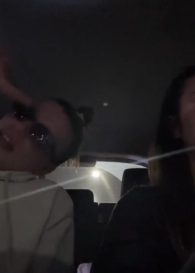 Two young women are in a car at night. The driver is focused on the road, while the passenger, wearing sunglasses and a light-colored hoodie, dances to the music. The car's interior is dark, with some light from streetlights and the dashboard.