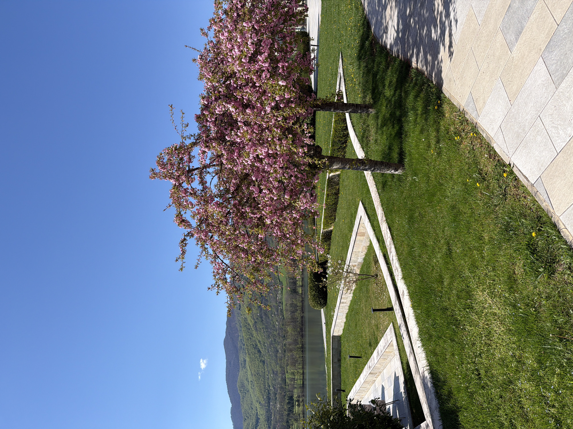 bright sunny day in what appears to be a landscaped park or garden in Razliv, Bulgaria. The sky is clear blue with a single small white cloud in the distance. In the foreground, there are two flowering trees with pink blossoms. To the right of the trees is a green lawn edged with light-colored paving stones. The lawn features a design of concrete or stone borders creating triangular shapes. Further back, there is a body of water reflecting the surrounding landscape, possibly a lake or pond, with mountains covered in green forest visible in the background.