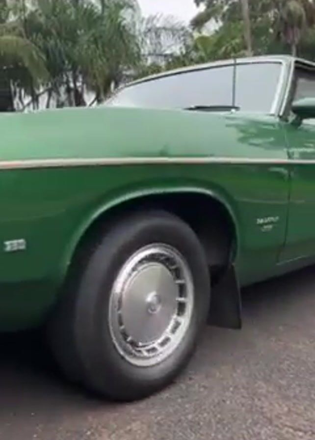 green classic car, a Falcon 500, parked on an asphalt driveway. The camera pans from the front to the side, showing its emblem and wheel well, with the silver hubcaps. Palm trees and other greenery surround the area. The background includes a residential street and houses across from the property. The weather appears overcast.