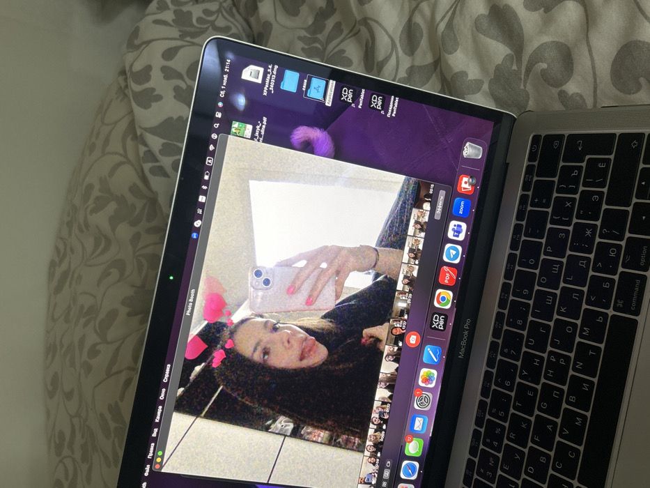 A silver MacBook Pro laptop with a Cyrillic keyboard layout is depicted resting on a light-colored blanket featuring a grey floral pattern, presumably in Novosergievka, Russia. The laptop screen displays the "Photo Booth" application, showing a young female with long dark hair captured by the webcam. She is holding an iPhone with a light-colored case and pink-painted fingernails, appearing to take a selfie, with pink heart filters superimposed above her head. Her tongue is slightly extended in a playful gesture. The laptop's macOS desktop, visible around the Photo Booth window, includes a dark purple background with various application icons in the dock and on the desktop itself, such as files named "XPPenMac_3.4_240313.dmg" and "zajezdy_jazyk_.pdf". The menu bar indicates "Photo Booth" is active, and the status bar shows the date and time as "СБ, 1 июля, 21:14" (Saturday, July 1st, 21:14) with a green light indicating the webcam is active.