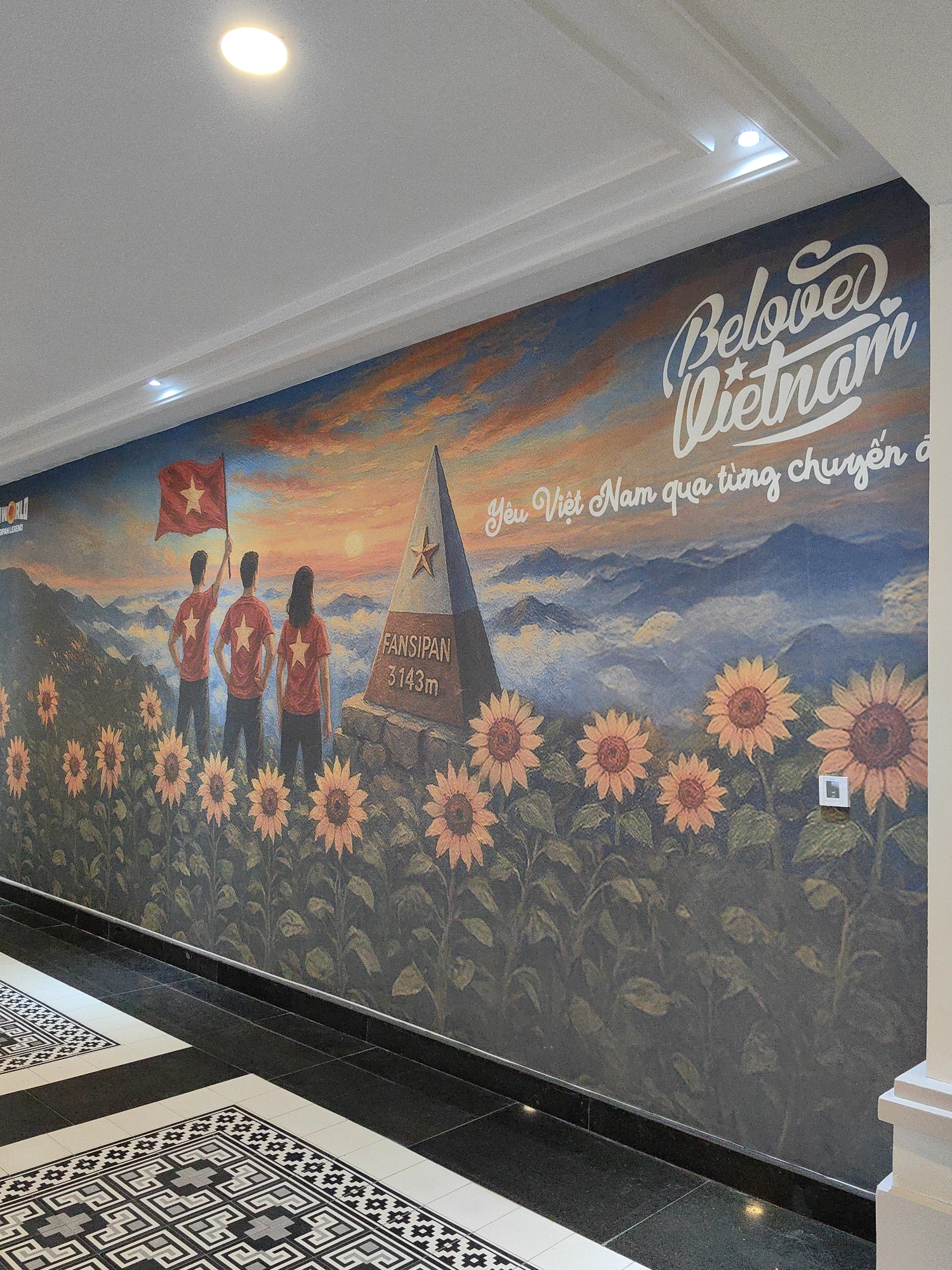 The image displays an interior hallway within a building associated with Sun World Fansipan Legend in Sa Pa, Vietnam. A large mural covers the entire visible wall, depicting a mountainous landscape under a sunset or sunrise sky. Three figures, viewed from behind, stand on a ridge in the center, wearing red shirts with yellow stars. The leftmost figure holds a red flag with a yellow star. To their right stands a triangular monument inscribed "FANSIPAN 3143m," featuring a yellow star. The lower portion of the mural is filled with numerous sunflowers. White script on the upper right reads "Beloved Vietnam" and "Yêu Việt Nam qua từng chuyến đi" (Love Vietnam through every journey). A partial "SUN WORLD FAN SIPAN LEGEND" logo is visible on the mural's far left. The white ceiling features recessed circular and linear lighting fixtures. The floor consists of black tiles interspersed with decorative white and grey geometric patterned tiles. A black skirting board runs along the base of the mural. A small white square object, likely a control panel, is mounted on the mural within the sunflower section on the right. A white architectural column is partially visible on the far right.