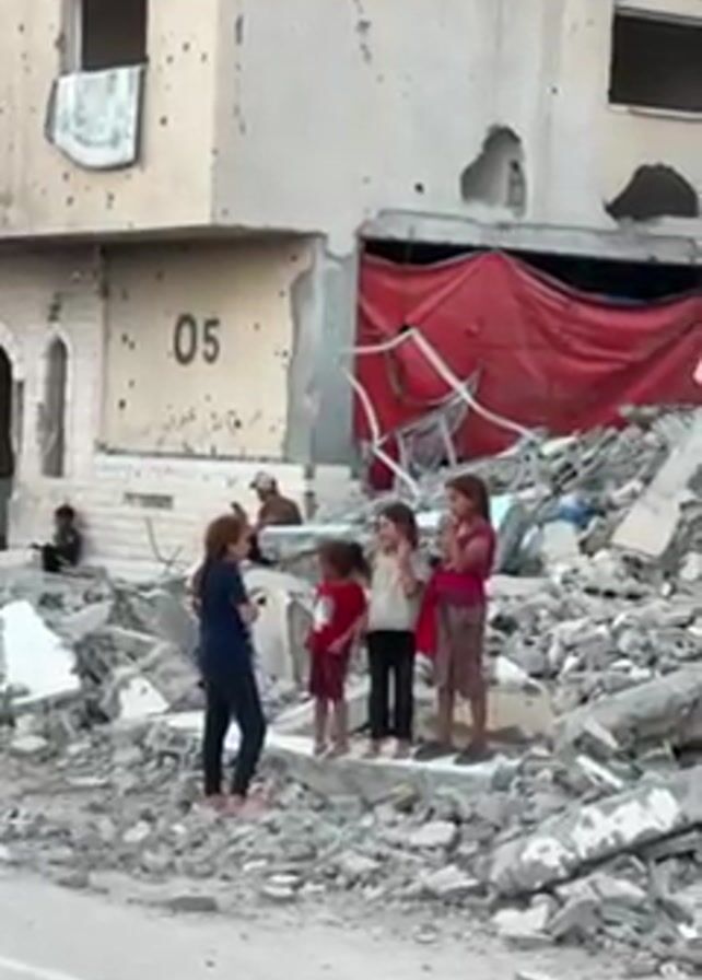 children standing on a large pile of gray rubble. Behind them, a multistory building has been severely damaged, with large portions missing. A red tarp hangs over a section of the building. Several children are walking and playing on the rubble. Some appear to be watching the person recording the video.