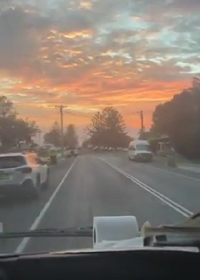 view from the inside of a vehicle driving down a paved road. The sky is visible through the windshield and displays a colorful sunrise with streaks of orange, yellow, and grey. There are power lines and trees along the side of the road, as well as parked cars and a white van. The interior of the vehicle has a roll of toilet paper and other items visible on the dashboard.