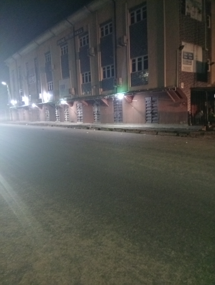 A nighttime photograph captures a multi-story building fronting a paved road in Umuode, Nigeria
