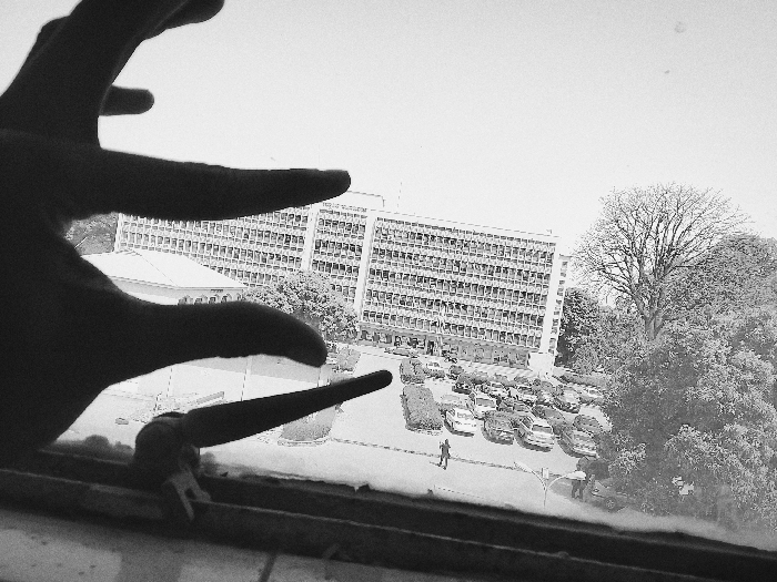A black and white photograph depicts an outdoor scene in Shaba, Nigeria, viewed from an elevated perspective through a window. In the immediate foreground, the silhouetted form of a human hand is prominently positioned in the upper left, partially obscuring the background. Below the hand, a dark window frame and a window latch are visible along the bottom edge of the image. The background features a large, multi-story building with numerous grid-patterned windows, indicative of an office or institutional structure. In front of this building, a parking lot contains multiple vehicles, including sedans and SUVs. Two individuals are observable at ground level: one person is walking on a paved area to the left of the parking lot, and another individual is partially visible near the right side of the parking lot, possibly under an umbrella or canopy. Extensive vegetation surrounds the area, including several trees with dense foliage and one large, prominent deciduous tree with bare branches situated to the right of the main building. The sky above is bright and clear.