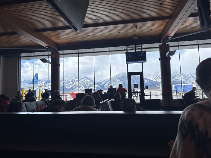 An airport gate area filled with people, viewed from within. A large window reveals a snowy mountain range outside. A United Airlines plane is visible on the tarmac. A digital flight information display board hangs above a doorway. Seating lines the foreground, partially obscuring the view. People are seated, standing, or walking around the gate area. The ceiling is high, with wooden beams and modern lighting fixtures.