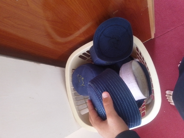 This image depicts an indoor scene within Quetta City Tehsil, Pakistan. A light-colored plastic basket, featuring a grid-patterned side, rests on a red carpeted floor. The basket contains numerous prayer caps; most are dark blue, with at least one displaying light yellow embroidery on its crown. A single light purple cap is also visible, inverted, within the basket. A bare human left foot is visible on the red carpet in the lower-left, positioned near the basket. A human left hand, partially covered by a dark sleeve, is shown reaching into the basket, holding one of the dark blue, horizontally ribbed prayer caps. The background consists of a plain white wall on the upper left and a vertical section of a polished wooden surface, likely a door or piece of furniture, on the right.