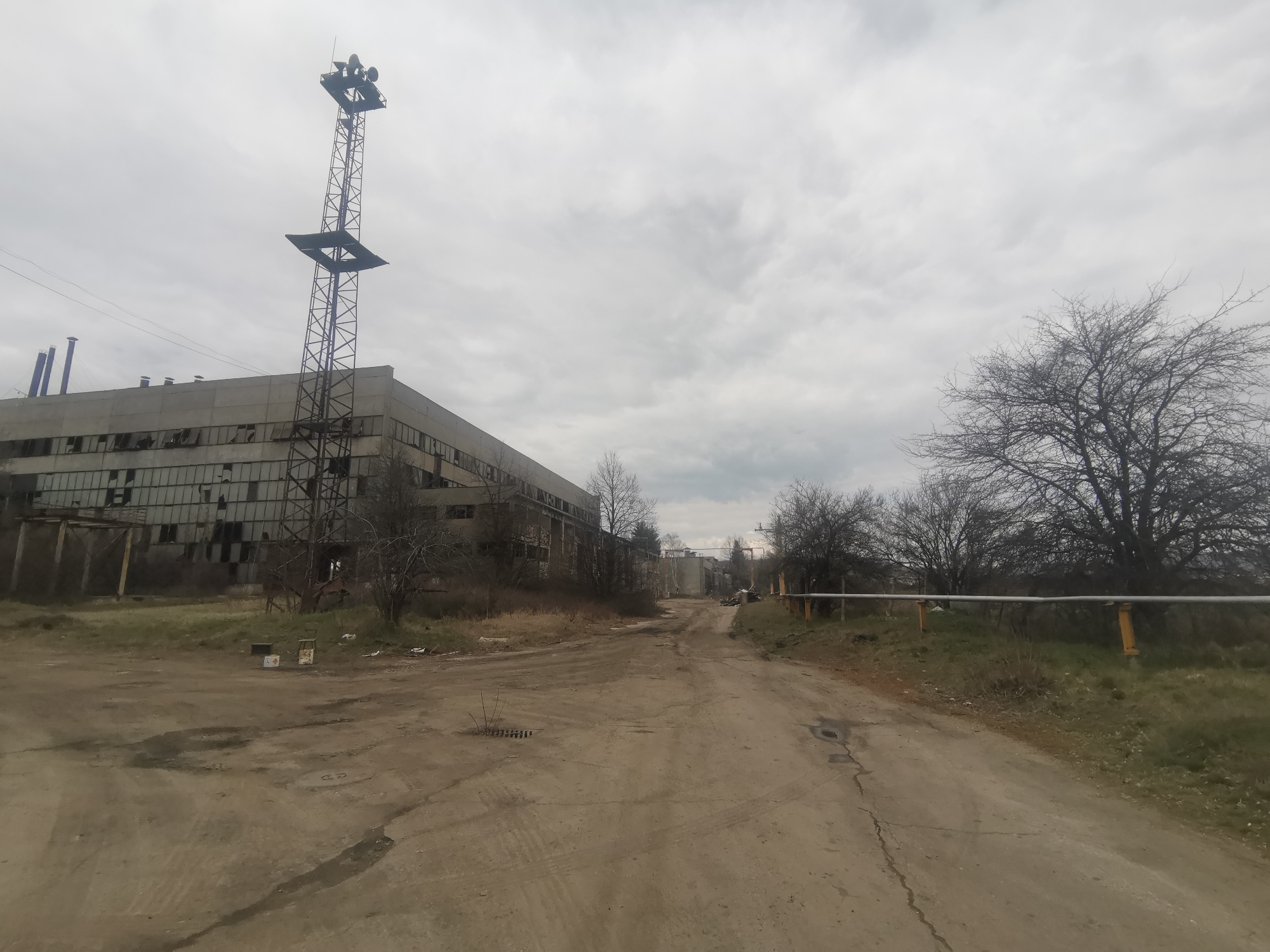 The image depicts an abandoned industrial area in Zhivkovo, Bulgaria, under a uniformly overcast, light grey sky
