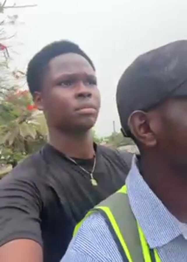 Two dark-skinned men are traveling on a vehicle. The man closest to the camera appears to be younger, wearing a black t-shirt and gold chain. The other man wears a striped shirt with a neon yellow reflective vest and a black baseball cap. They are traveling on a gray day with trees in the background.